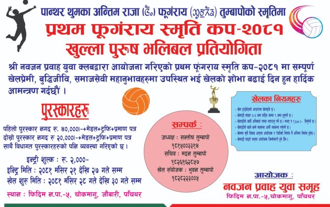 मनोज थापा पाँचथर, १७ मंसिर २०८१-पूर्व कुलपति प्राज्ञ श्री बैरागी काँइला ज्युको प्रमुख आतिथ्यतामा आगामी २०८१ मङ्सिर २२ र २३ गते धरानमा “सम्बाहाङ्फे उत्थान संघ” को चौथो राष्ट्रिय महाधिवेशन र वंशावली विमोचन (प्रकाशन) कार्यक्रम आयोजना हुने भएको छ। सम्बाहाङ्फे उत्थान संघ केन्द्रीय कार्य समितिले सम्पूर्ण सम्बाहाङ्फे दाजुभाई, दिदिबहिनी, इष्ट मित्र, कुलकुटुम्ब र शुभचिन्तकहरुमा यस महत्त्वपूर्ण अवसरमा उपस्थित भई कार्यक्रमलाई सफल बनाउन...