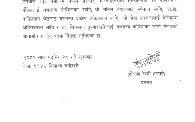 राष्ट्रपति कार्यालयका अनुसार प्रकाशमणि पौडेललाई पोर्चुगल, सनिल नेपाललाई स्पेन, प्रा.डा. कपिलमान श्रेष्ठलाई दक्षिण अफ्रिका, सेवा लम्साललाई बेल्जियम र डा शिवमाया तुम्बाहाङफेलाई दक्षिण कोरियाका लागि आवासीय राजदूत पदमा नियुक्त गरिएको छ।